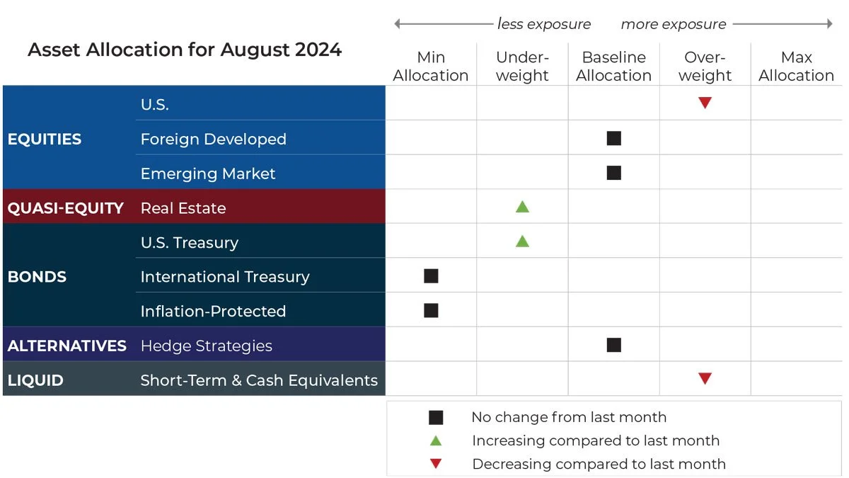 Foreign developed and emerging markets allocations will remain steady heading into August. Emerging markets remain just ahead of their developed-market counterparts for the year, but both continue to be weaker relative to U.S. equities.